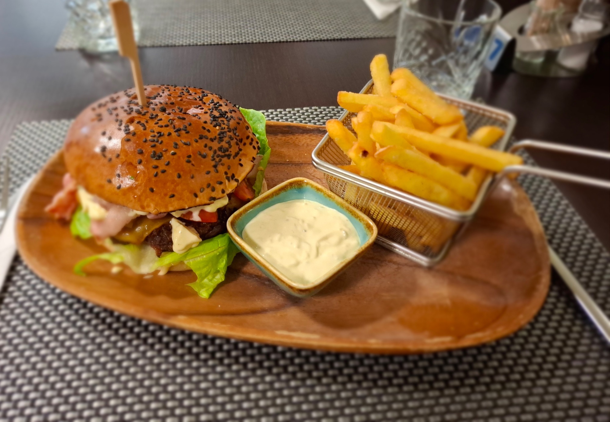 Jelení Burger s chedarom, slaninový džem, brusnicová majonézou, hranolky s javorovým sirupom a opečenou slaninkou 1,7 -